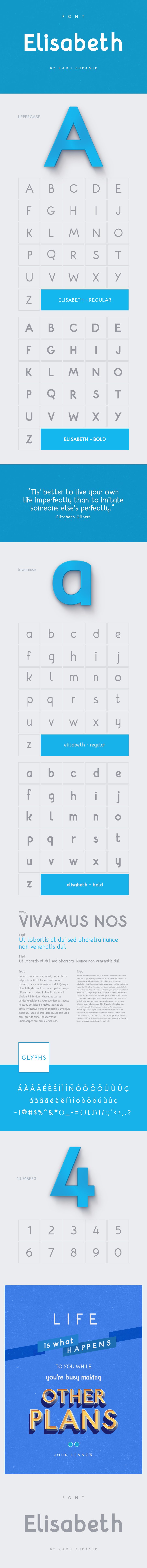 Elisabeth is an free uppercase e lowercase display typeface inspired by the classic sans serif font family's. This typeface is, because of his many alternative options, perfect for usage in posters, text, and headlines.